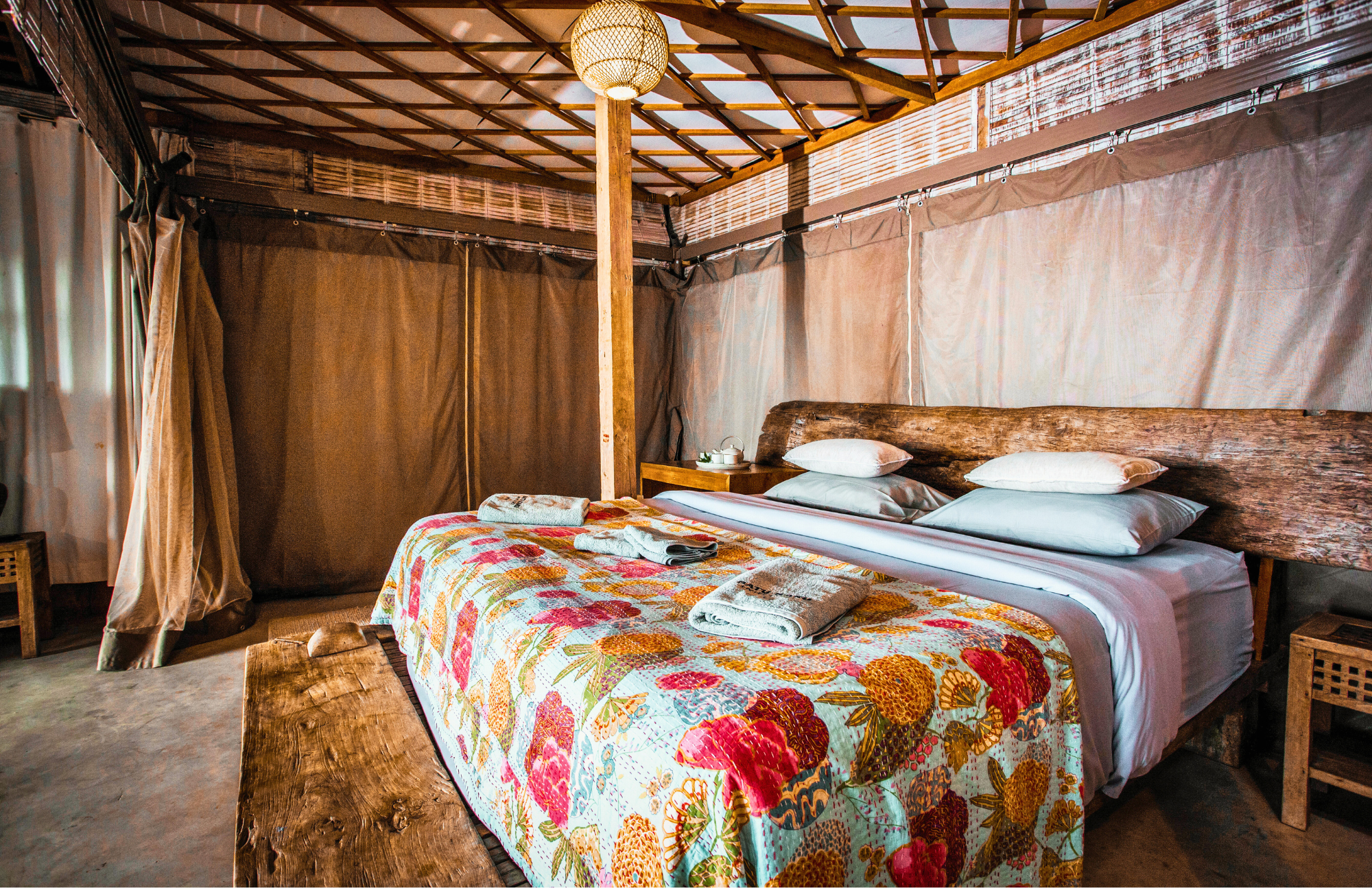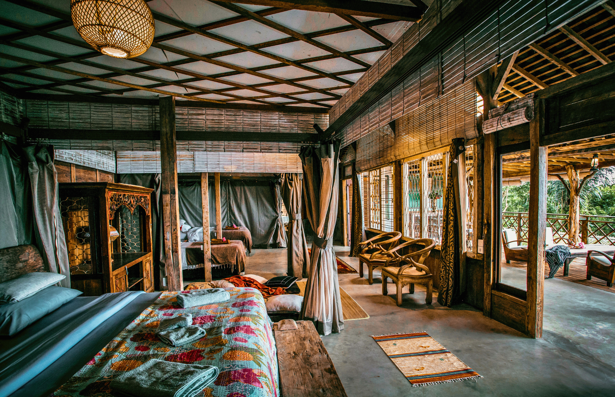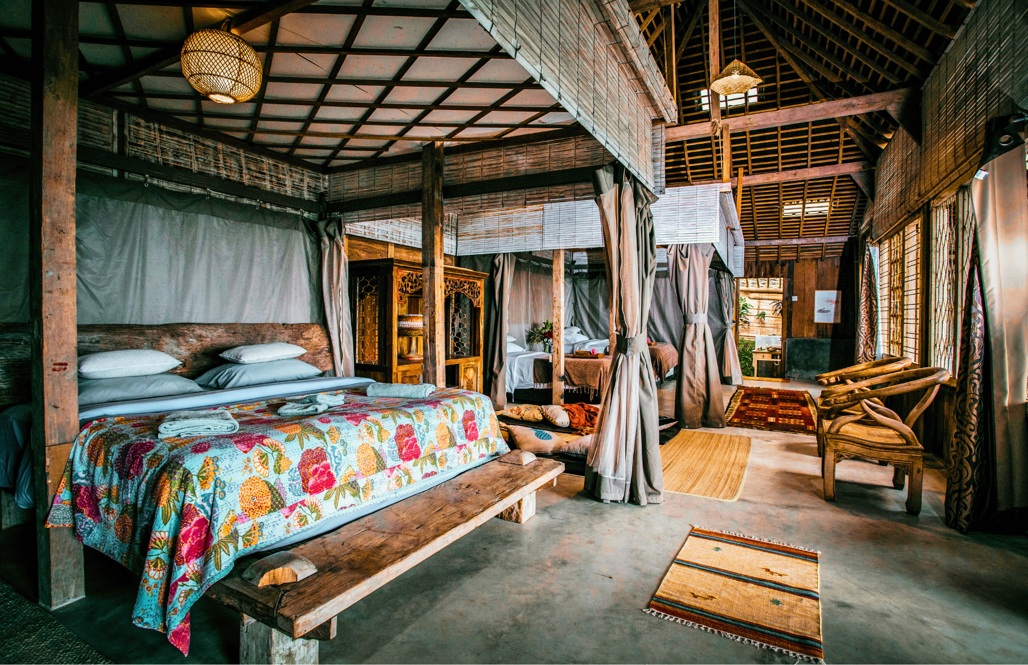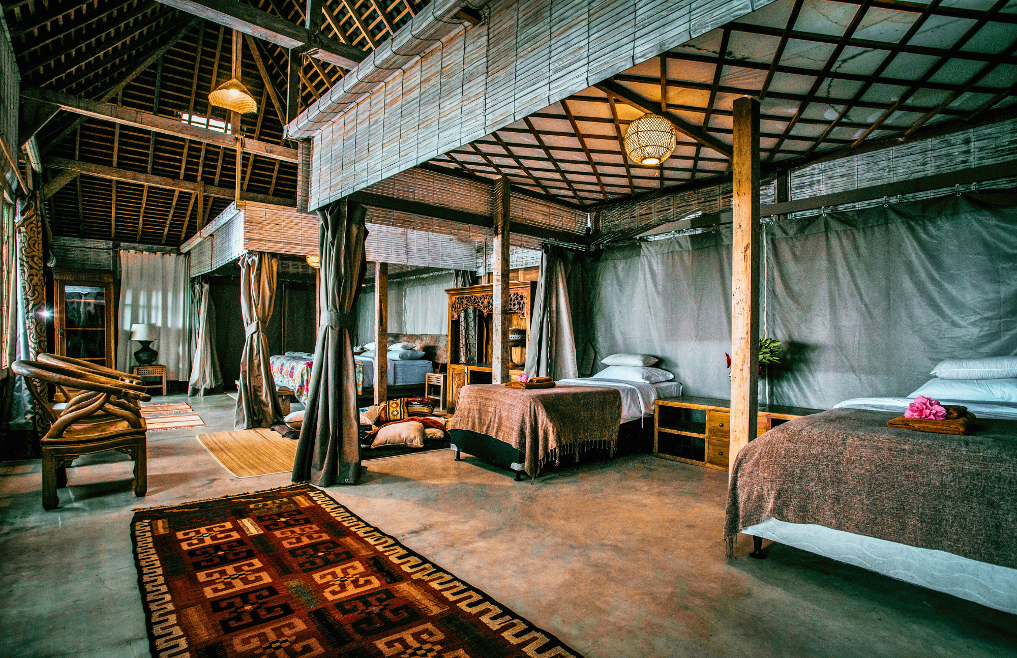 the joglo is one large open room with three generous sleeping zones separated by soft privacy curtains. not a wall, not a glamping blind, just beautifully crafted fabric that gives each of you your own little sanctuary while still keeping the space calm, open and connected.